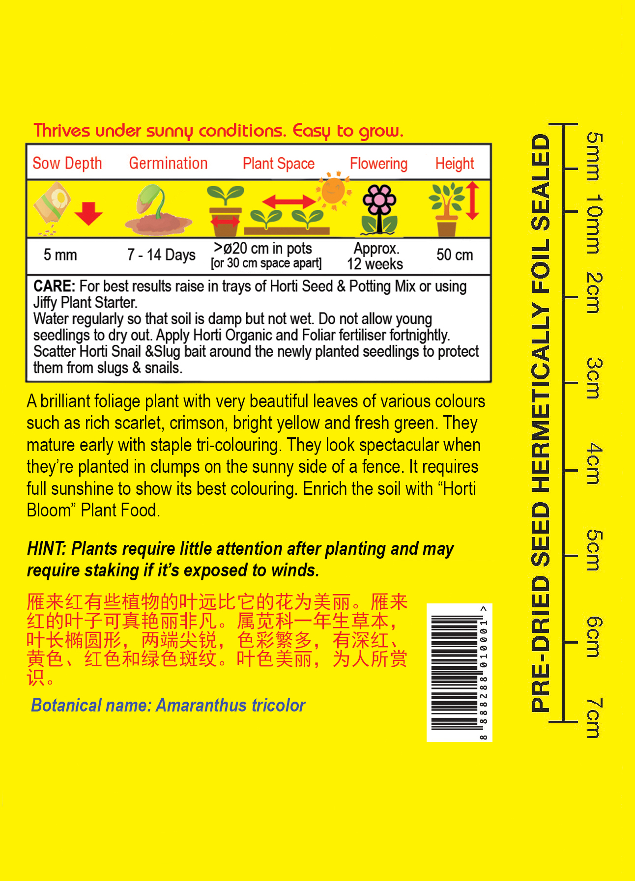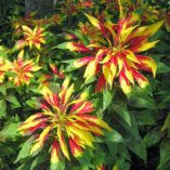 Amaranthus is a brilliant foliage plant with very beautiful leaves of various colours such as rich scarlet, crimson, bright yellow and fresh green. Amaranthus mature early with staple tri-colouring. Amaranthus look spectacular when they’re planted in clumps on the sunny side of a fence. It requires full sunshine to show its best colouring.