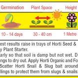 Sowing: Sow seed direct when plants are wanted. Plant seed 10mm deep and cover with Horti Seed & Potting Mixture. Firm down and keep moist. A good plan is to sow groups of 2 to 3 seeds about 40cm apart – then there is no need to thin out.