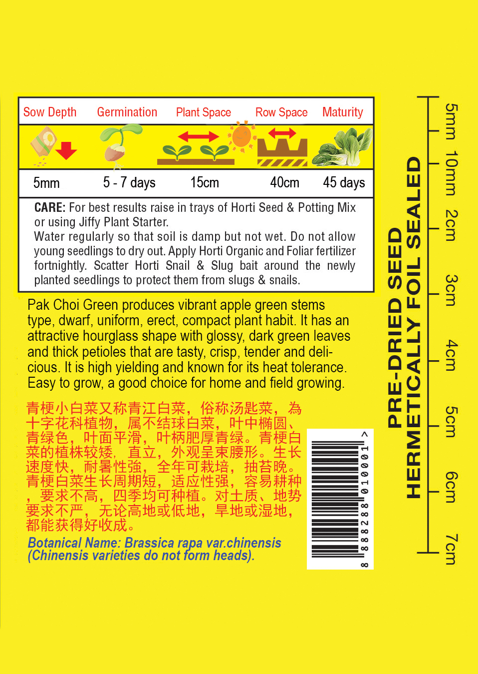Pak Choi Green produces vibrant apple green stems type, dwarf, uniform, erect, compact plant habit. It has an attractive hourglass shape with glossy, dark green leaves and thick petioles that are tasty, crisp, tender and delicious.