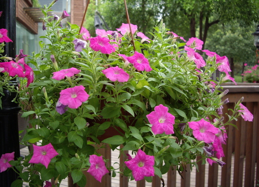 矮牵牛属茄科,花單生有如漏斗状,花色繁多,七彩缤纷,姣艳万分。植株矮小,最适合盆栽。性喜温暖与日照充足,排水及通风良好的环境。但要提防淋雨,过度潮湿会引起腐根而枯死。