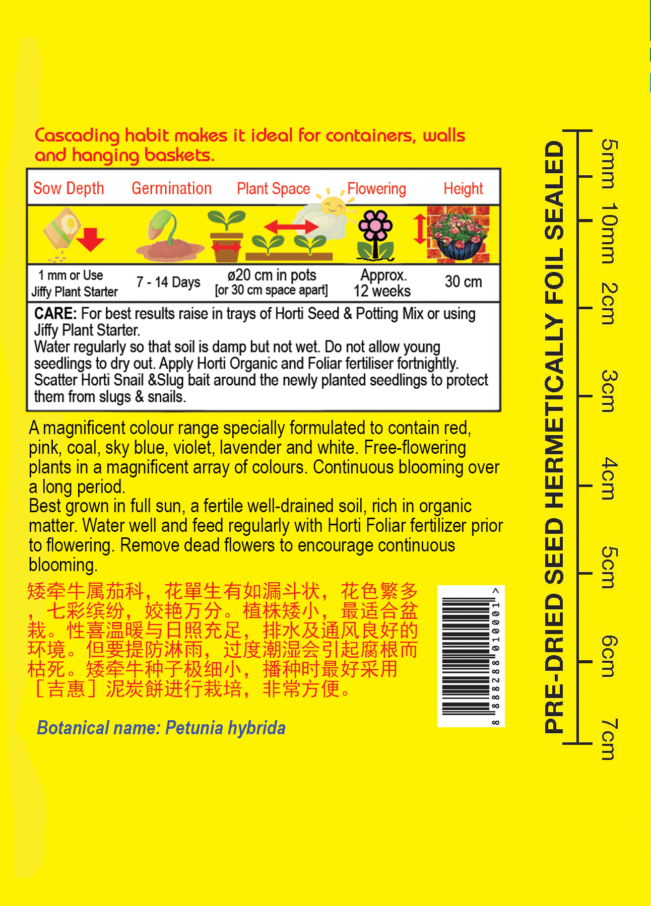 A magnificent colour range specially formulated to contain red, pink, coal, sky blue, violet, lavender and white. Free-flowering plants in a magnificent array of colours. Continuous blooming over a long period. Its cascading habit makes it ideal for containers, walls and hanging baskets.