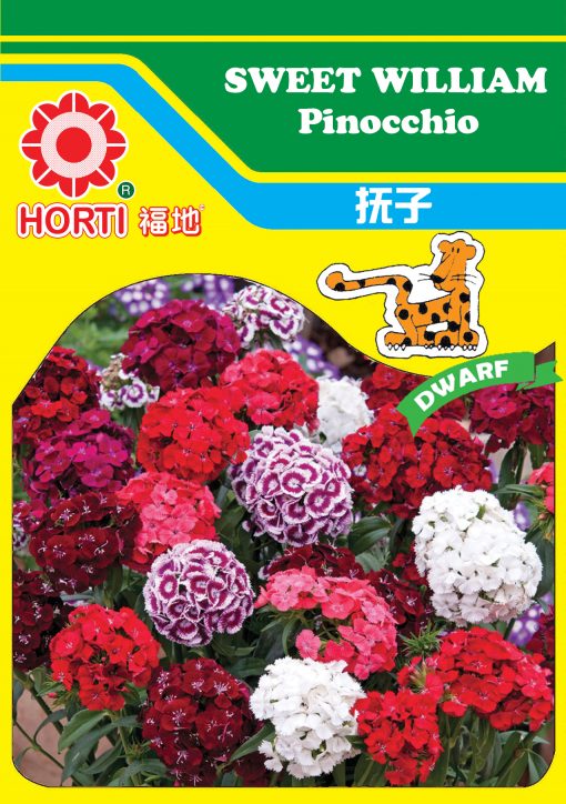 Dianthus Barbatus: A charming old favorite that is easily grown. Clusters of bright fragrant flowers are freely borne on strong stems. The dwarf, compact plants have large heads of zoned and eyed bloom in a wide range of colours.